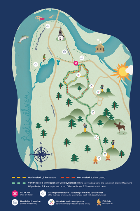 På Grelsbyberget finns vandrings- och motionsleder, rastplatser och eldstäder. Det är enkelt att ta sig till Grelsbyberget från centrala Överkalix med relativt barnvänliga stigar som leder till vackra utsikter, bland annat över Kalixälven, centrum, byn Boheden och Djupträsk. Ta med dig något att äta och stanna till vid vindskyddet som finns längst upp på berget. Längst lederna finns totalt 6 st rastplatser med bänkar och bord, varav 2 även med vindskydd och eldstäder (i övrigt råder eldningsförbud på Grelsbyberget). För att underlätta vandringen på berget finns även 15 st pausbänkar strategiskt utplacerade längs lederna.