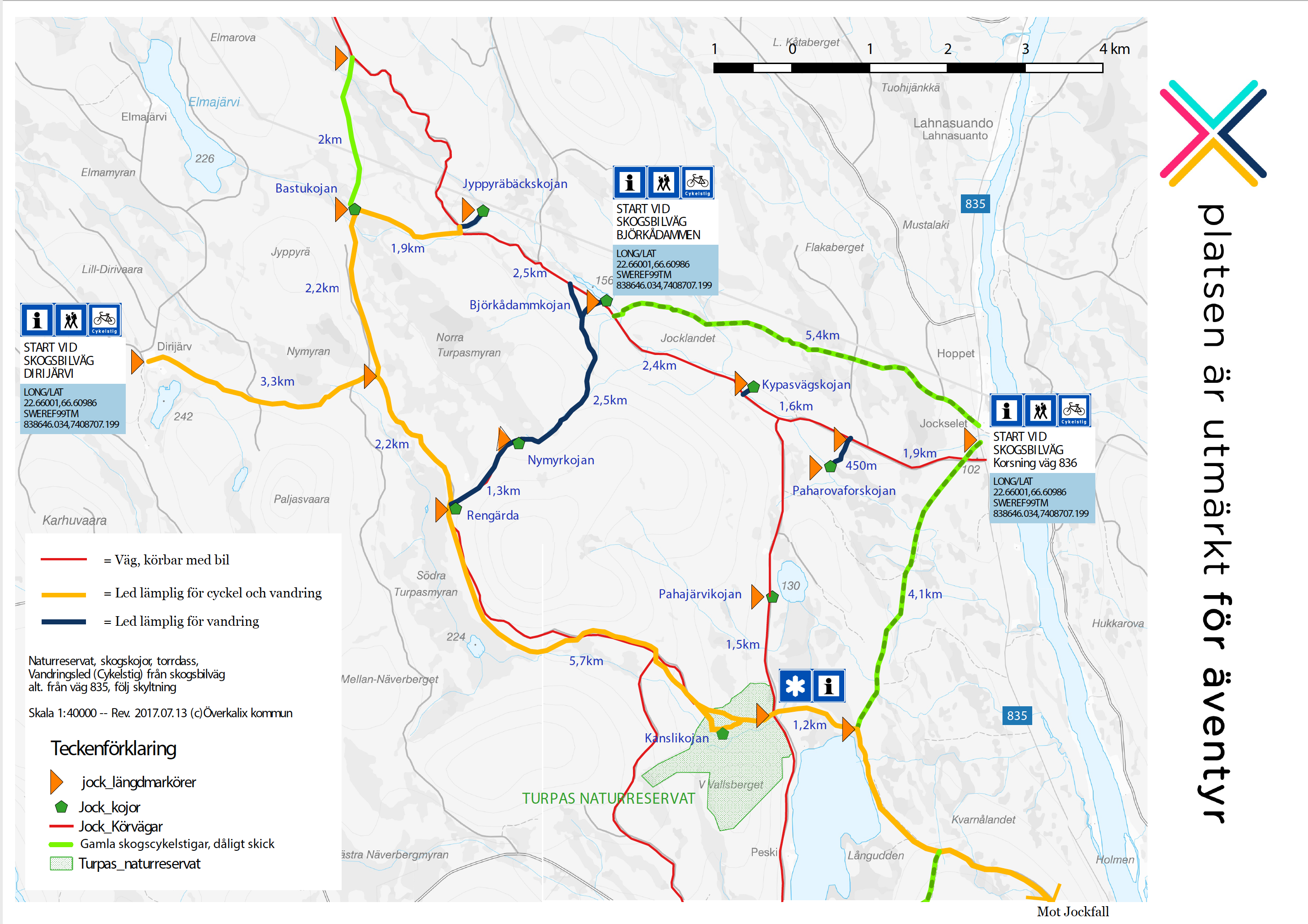 Klicka på förstoringsfyrkanten nere till höger. Klicka sen på textsymbolen uppe till vänster så kommer en lista fram med information om många besöksmål i naturen kring Överkalix.